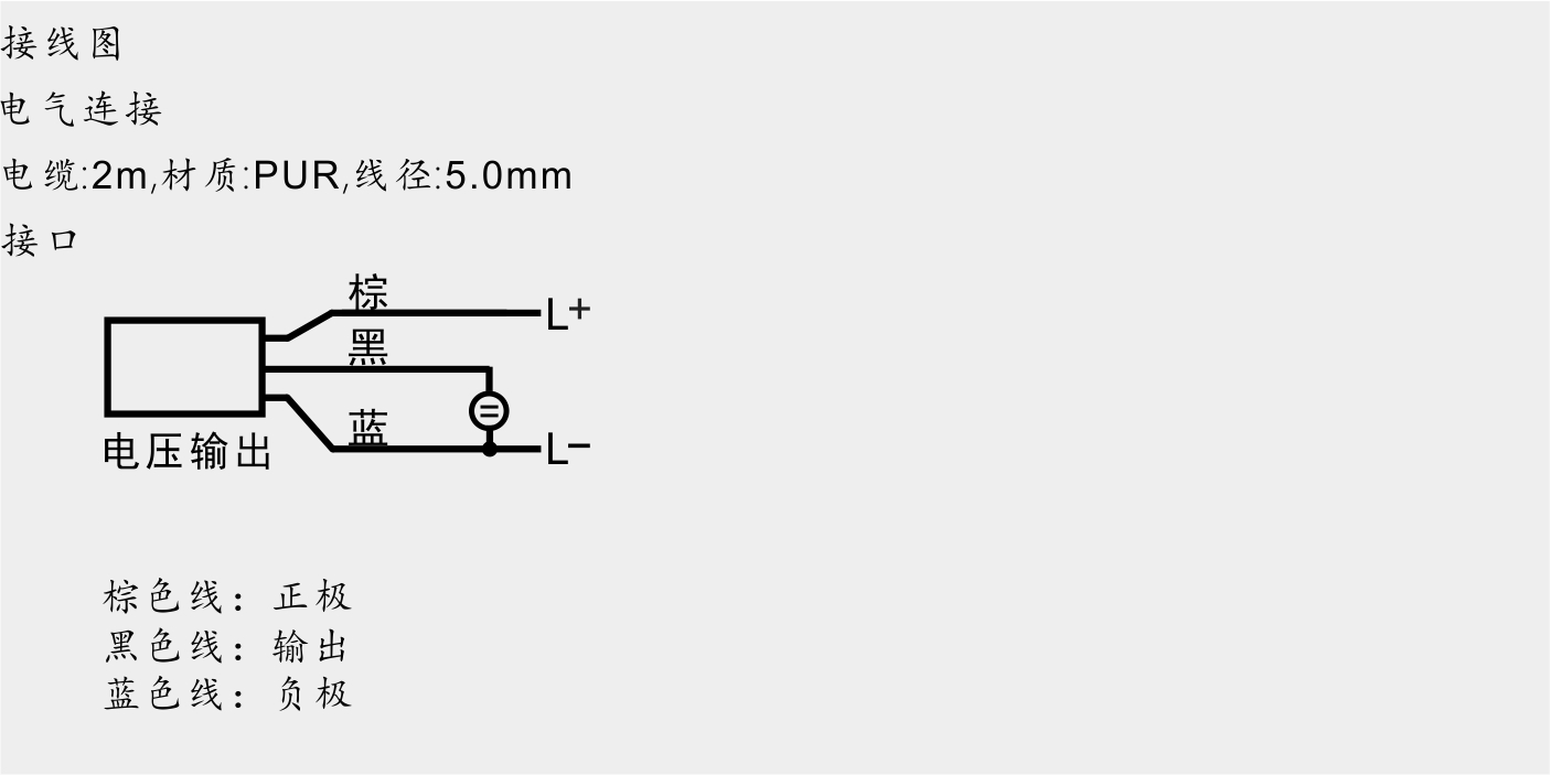 | 连接形式 | 电线引出;电缆线:2m,材质:PUR,线径5.0mm |